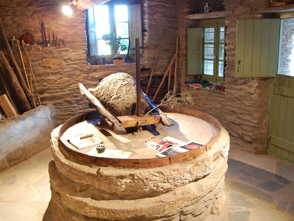 Στεγάζεται σε κτίριο περίπου 400 ετών που λειτουργούσε ως ζωοκίνητο ελαιοτριβείο έως το 1963. Αποκαταστάθηκε σύμφωνα με τον παραδοσιακό τρόπο κατασκευής κτιρίων στην Άνδρο και μετατράπηκε σε μουσείο, διατηρώντας όλον τον γνήσιο εξοπλισμό του. Ο επισκέπτης ξεναγείται διαδραστικά στην ιστορία της παραγωγής ελαιολάδου, έρχεται σε επαφή με γεύσεις και παίρνει μέρος σε τμήμα της διαδικασίας παραγωγής του.